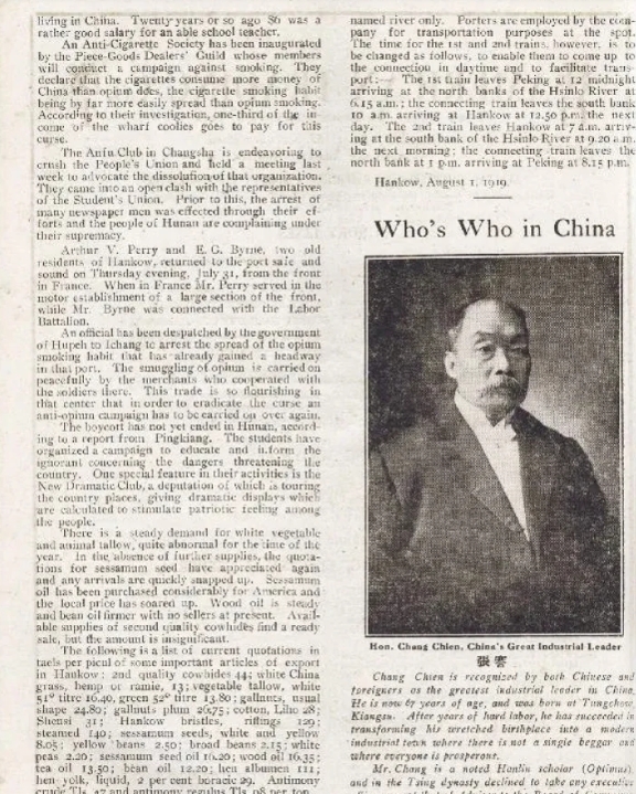 “从1919年至1926年张謇逝世,《密勒氏评论报》曾长期关注张謇,报道张謇主导下的南通的发展。”朱江告诉记者,“《密勒氏评论报》对张謇最早的报道,是刊登在1919年8月9日‘中国名人录’栏目(Who’s Who in China)里对张謇的介绍。该文采用了张謇着西装像,并标注为‘中国杰出的实业领袖张謇阁下’。”