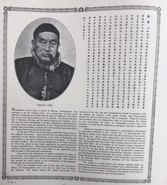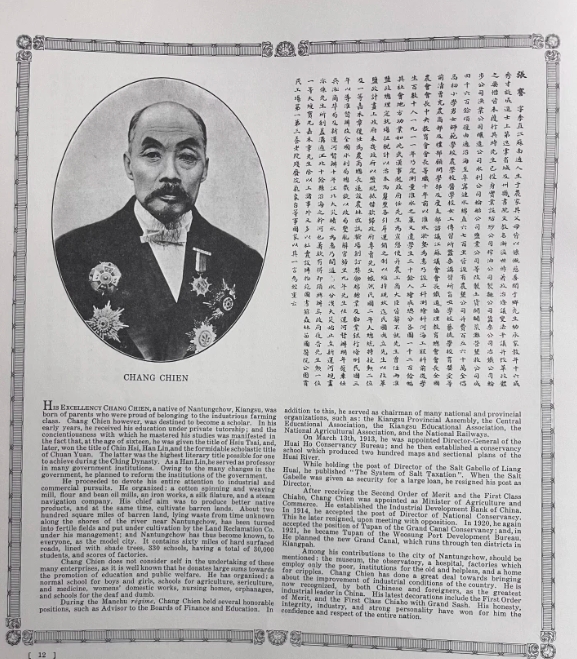 入选此书共有202位中国名人,集当时政治、实业、教育诸方面。以孙中山、袁世凯领衔,张謇排在第13位。张謇传略重点介绍其生平事迹,可看作对其一生事业的总结。
