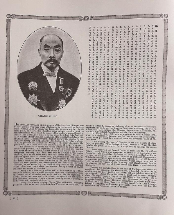 共有202位中国名人入选此书,集当时政治、实业、教育诸方面。以孙中山、袁世凯领衔,张謇排在第13位。张謇传略重点介绍其生平事迹,可看作对其一生事业的总结。