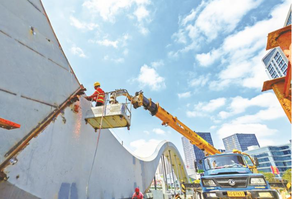 昨天,施工人员正在五龙汇片区的永昌路大桥桥面施工。永昌路大桥横跨通扬运河,全长约600米,规划双向4车道,目前进入桥面美化阶段。大桥在设计上与邻近的城闸大桥保持协调一致,主拱造型与乐器竖琴相仿,拱为琴头,拉索为琴弦,立面搭配五道波浪元素,奠定五水的蓬勃基调。 李斌摄