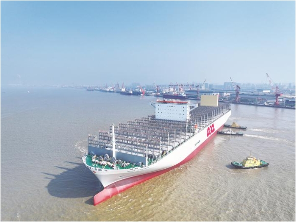 昨天,“中远川崎397”集装箱船出海试航。当日,由江苏南通中远海运川崎船舶工程有限公司自主设计、研发制造的“中远川崎397”集装箱船出海试航。该船长399.99米、型宽61.3米,型深33.2米,可装载24188个国际标准集装箱。记者 许丛军摄