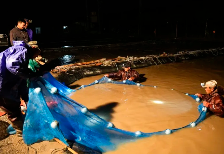 7日晚,如东长沙镇卫海村的乡道上,停满了前来装苗的货车;淡化池边,工人们借助灯光吸引大眼幼体开展捕捞作业,岸上的白筐里,完成淡化的“大眼宝宝”通体晶莹剔透,爬上爬下一刻不停,显得活力十足。