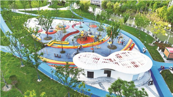 “乐享园林”小游园围绕中心草坪空间,设置了多个儿童活动区域,形成趣味变化而形式统一的活动场地。同时,周边还设置城市驿站、配套服务等多种城市服务,结合科普教育内容,打造绿色文化节点。 李斌摄