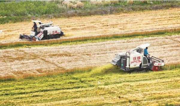 昨天是小满节气,崇川区幸福街道的现代农业产业集中区内,多台收割机开镰收割大麦。今年,崇川现代农业区大麦亩产可达500公斤左右,比去年增产约5%,再迎丰收年。 记者 许丛军摄