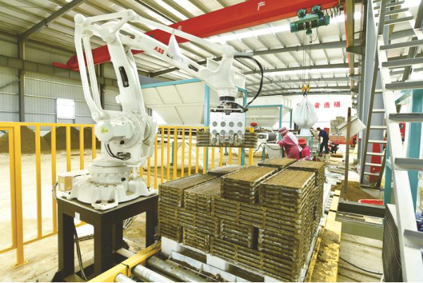 昨天,南通季和智慧农业有限公司车间里,水稻智能化育秧流水线正在作业。摆盘、铺土、投种、覆土,机械臂精准码垛,再由铲车运走进行叠盘暗化处理。与人工相比,速度提高了3倍。海安积极推广育秧全程机械化,提高育秧质量和效率,节省育秧成本。