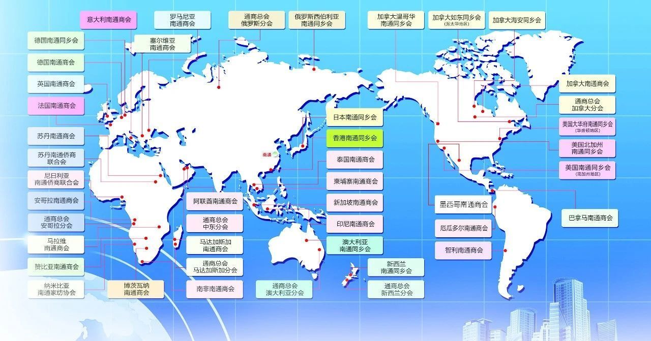 从“三军”闯天下到“新侨之乡”,目前,通商总人数已近百万,其中走出国门达10万人,足迹遍及120多个国家和地区。南通组建市外商会93家、境外商会45家,赢得了“哪里有市场,哪里就有通商”“江海联五洲,通商通天下”的赞誉。