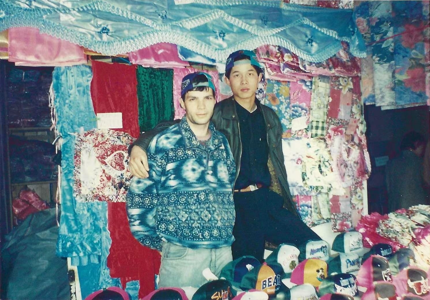 1997年,林西村“郁家军”成员郁礼平(右)与当地商贩合影。(资料照片)