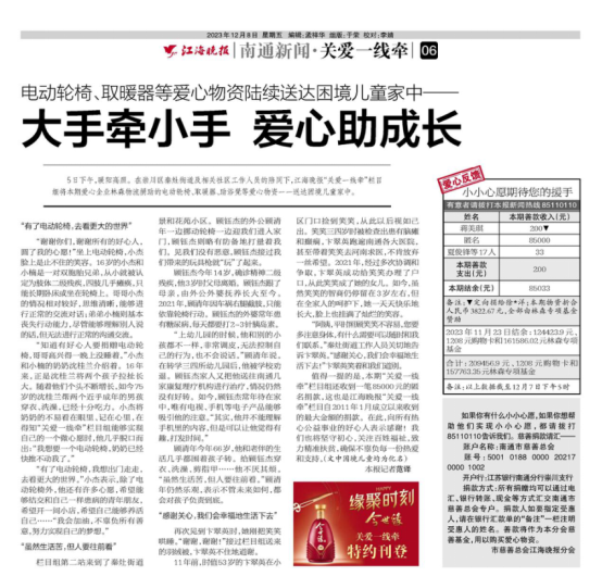 《江海晚报》2023年12月8日“关爱一线牵”版面