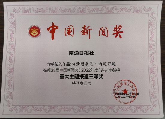 制作的融媒体纪录片《向梦想靠近 南通好通》、10集系列政论片《10年奋进路》、短视频《南通动与静》等一系列融媒体精品,获得极佳的传播效果,分别获得2022年度江苏省好新闻媒体融合类一、二、三等奖。其中,《向梦想靠近 南通好通》荣获第33届中国新闻奖重大主题报道三等奖,全网点击量超过2亿人次,成为现象级产品。网络新闻《海太长江隧道今天开工,为世界最长、中国断面最大的公路水下盾构隧道》获第26届江苏新闻奖。
