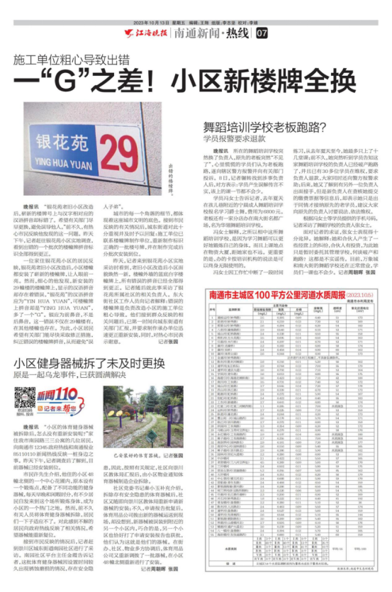 集团设置民生热线部,公开报料热线电话,常态化开展批评性和调查类报道,通过抽丝剥茧式采访,解析社会发展中的难点难题,对不良现象进行曝光揭露,刊发《施工单位粗心导致出错 一“G”之差!小区新楼牌全换》《小区健身器械拆了未及时更换》《舞蹈培训学校老板跑路?》等舆论监督类报道160多篇。《南通日报》还与政府12345热线协作开设“民心专列”周报栏目,有效开展新闻舆论监督,推动城乡环境治理、生态文明建设、文明城市创建等工作高质量推进。
