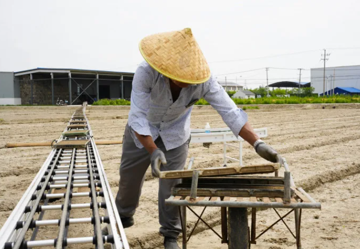 洋口镇洋口村种粮大户康宜斌在村里流转了800亩土地,夏种品种为宁香粳9号。21日至22日,抢抓两个大晴天,他将8000斤稻种全部播种下去。记者跟随农技专家来到育秧田时,康宜斌正在组织工人摆盘、盖膜,超过28000张秧盘整齐划一地排列在田间,一眼望去,颇为壮观。“县里的专家在水稻育秧的温度湿度、育秧周期等方面给我们进行现场指导,后续有不懂的地方,还可以线上咨询,我们育好秧的信心更足了!”