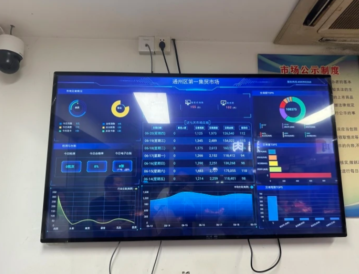 6月20日上午,走进位于金沙街道的通州第一集贸市场,门口的电子大屏滚动播放公益广告、第一集贸市场农产品快检公示信息,值班室内的显示屏上清晰呈现市场交易情况、近七天市场交易等,从各摊位上方的显示屏则可以看到商户姓名、行业、商户营业执照及今日菜价等,每个商户统一配置电子“公平秤”。