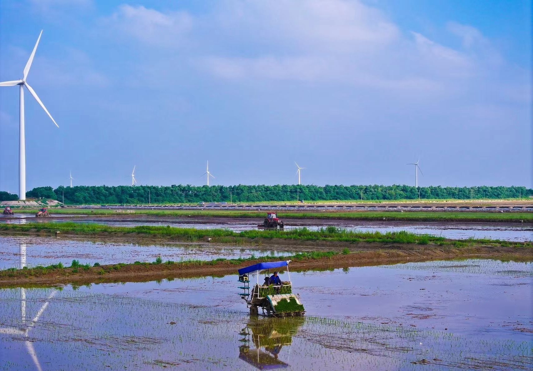 梅雨时节是水稻移栽的关键时期。6月21日,江苏南通如东县掘苴垦区盐碱地改良示范基地三期项目地块里,两台插秧机来回作业,一株株嫩绿的秧苗从苗盘上整齐有序地插入田间,原本空旷的水田逐渐洒满喜人的新绿。今夏,基地将种植5750亩水稻。