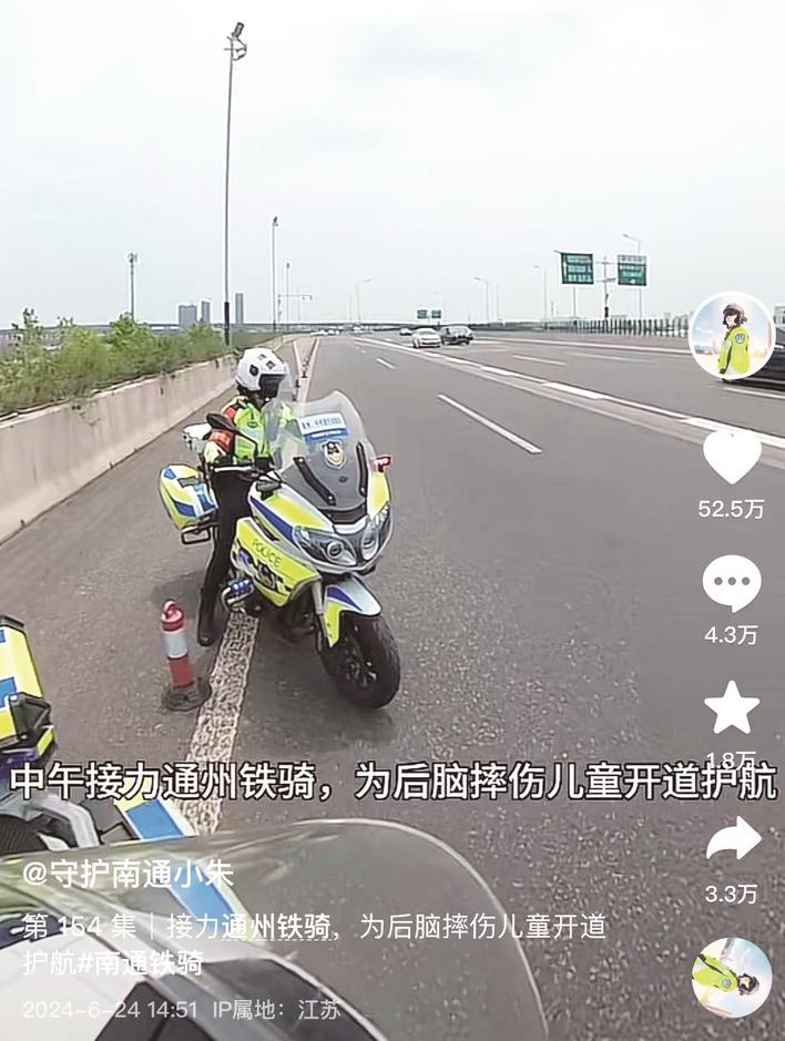 24日中午,南通市公安局交警支队七大队铁骑队员在市区江海大道高架上执行车流疏导任务时,对讲机里突然传来交警指挥中心的紧急指令,一名儿童摔伤后脑需紧急送往通大附院救治,家属车辆正由通州铁骑带路护送进入主城区。