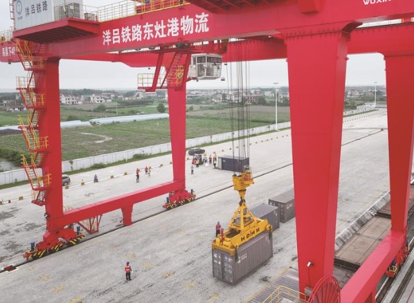 12日,洋吕铁路东灶港物流园迎来首趟重载集装箱到达专列。8个重载集装箱装载锰硅合金,是中天钢铁(南通)公司绿色精品钢生产的重要原材料,通过洋吕铁路运输大幅减少了货物短驳费用,还提升了运输效率。
