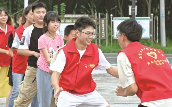 昨天,南京工业大学建筑学院大学生志愿者与孩子们一起做游戏。当天,南京工业大学建筑学院暑期支教实践团队22名大学生志愿者来到海安市墩头镇千步村,为当地儿童带来文体、科普、艺术等方面的兴趣课程。这是该学院连续11年来此开展暑期活动,为乡村孩子带来知识与欢乐。周强