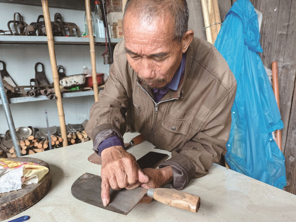 菜刀作为厨房必备品,是家家户户日常所需之物。在刘桥镇街东头,有一家不起眼的铁匠铺,时常有慕名而来购买菜刀的人。“有上海的,也有新疆的,只要到刘桥,他们就想带几把刀走。”马春芳今年82岁了,制作菜刀已经有30多年。和市面上卖的普通刀不一样,他的刀在两层铁的中间夹着一层钢,具有耐磨耐用等特点。