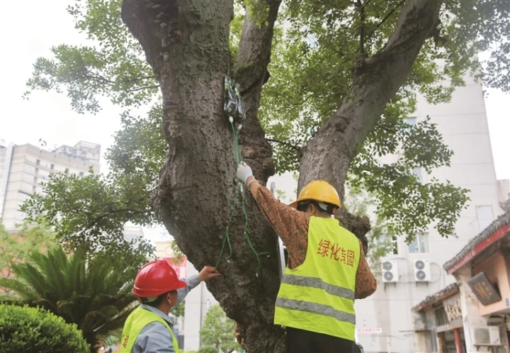 濠河景区内共有古树名木70棵,树龄最长的超过700年。炎炎夏日,市濠河办对辖区内的古树名木及珍贵树种实施抢救复壮、挂营养液、安装避雷针、病虫害防治等措施,守护它们安然度夏。 记者 尤炼摄