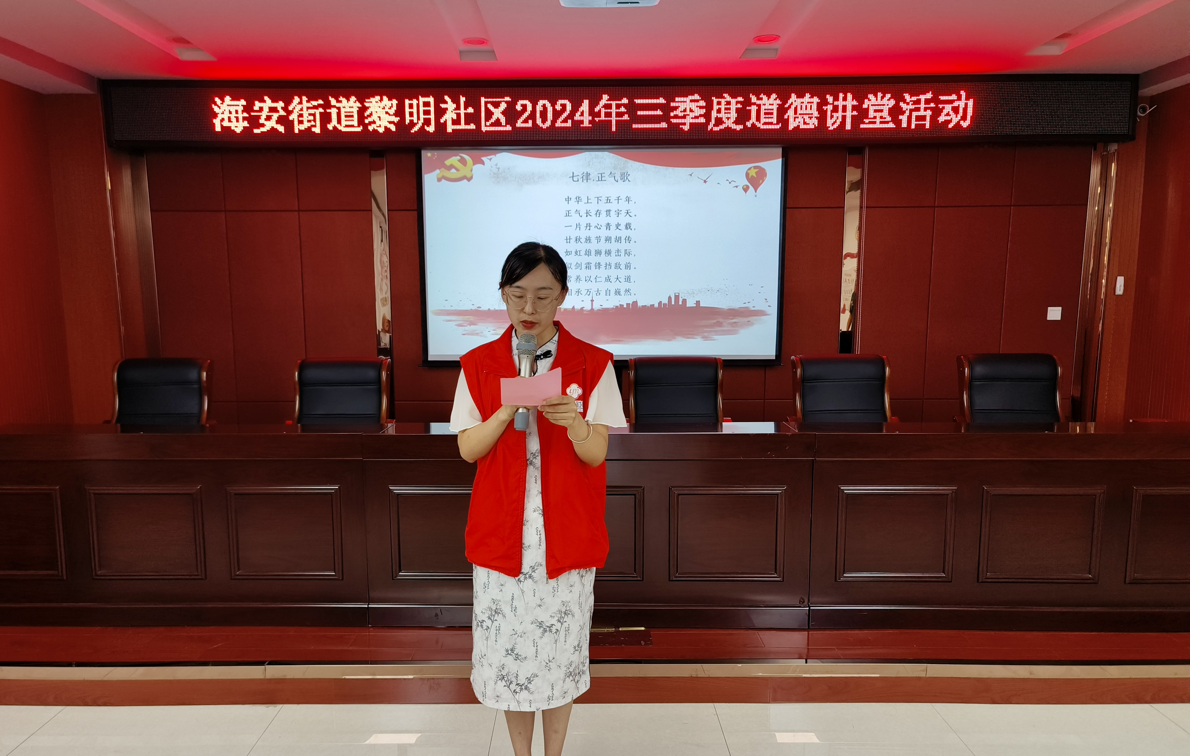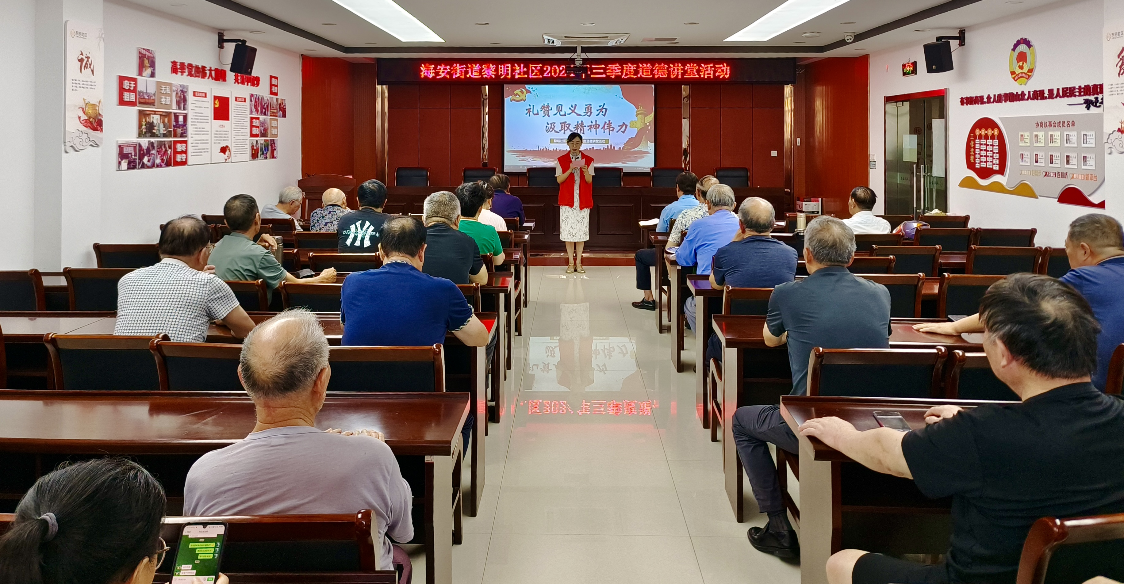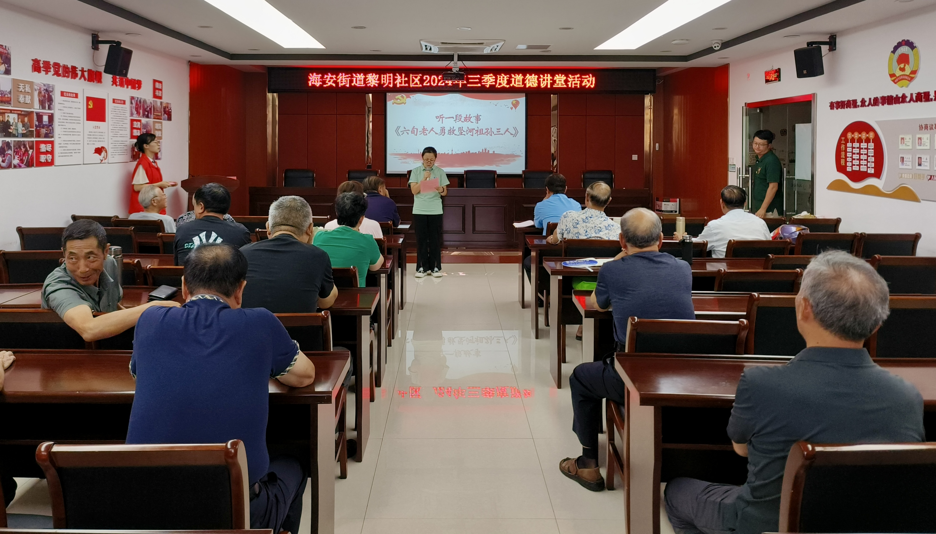 8月24日上午,海安街道黎明社区新时代文明实践站联合社区党总支组织辖区居民在市民教育室开展“礼赞见义勇为 汲取精神伟力”2024年三季度道德讲堂活动,通过唱歌曲、看视频、学模范、诵经典、谈感悟、送吉祥六个环节,学习道德模范,宣扬道德品质,让见义勇为精神德行天下,共同构建平安、幸福、和谐社区!