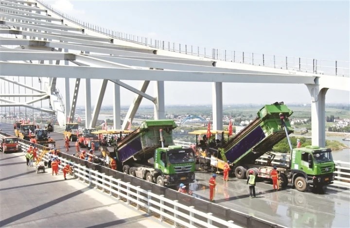 “这种新型材料施工时根据新工艺的要求,不能有施工人员的汗水、桥面的飞灰、机械的油漏、空调的冷凝水等的影响,初压、复压、终压的温度必须控制在155℃、110℃、90℃以上……因此对施工人员的要求十分严苛。”当记者和施工人员谈起这些,他们没有怨言,只说“已经习惯”。“运用新材料、新工艺,依靠新技术,施工完成后桥面的沥青路面无论是疲劳韧性还是高温抗车辙破坏性都能达到世界前列。”