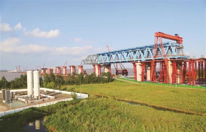 本报讯 (记者彭军君 通讯员孟庆虎 徐帆 臧超)昨日,经过72小时连续作业,由中铁大桥局承建的沪渝蓉高铁V标崇启公铁长江大桥非通航孔桥首个主跨112米钢梁顶推顺利到位(上图 孟庆虎摄)。目前,已完成56米、42米、112米三次钢梁顶推任务,累计顶推钢梁210米,约5400吨。