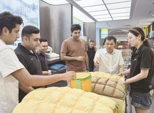 来自巴基斯坦的小伙Jason最近也是乐此不疲地带着他的印度客商来到叠石桥国际家纺城选货(上图)。“我们今年新推出了3D超细纤维枕头,这是我们自己研发的新产品,产品有质量保证,还有商标版权,相应的出口报关手续齐全。”在一家商铺,Jason带着他的客商听营业员讲解今年的家纺新品,边做翻译边交流。印度客商听完后纷纷竖起大拇指,连声说:“Very good!”Jason告诉记者,他已是叠石桥的常客,2015年起他就在南通注册创办了南通沙恩国际贸易公司,2018年开始正式从事家纺外贸工作,现在他的客户已经遍布世界各地。这次陪同印度客商亲自来选品,因为他们知道,这里的商品质量好,价格又十分合适,很受当地百姓欢迎。这批印度客商5月份曾经来到叠石桥选品,货到后仅一个多月就全部卖完了,这次他们一下子订了4个货柜的家纺产品,争取今年能够取得更好的销售业绩。“我这么多年之所以在三星镇一直待着不走,是因为我非常喜欢把叠石桥的家纺产品推荐到世界各地,我也很有成就感。”Jason说。