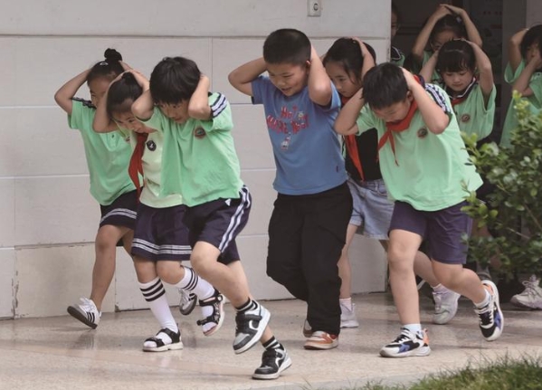 昨天,五山小学防空疏散演练现场。 记者徐培钦