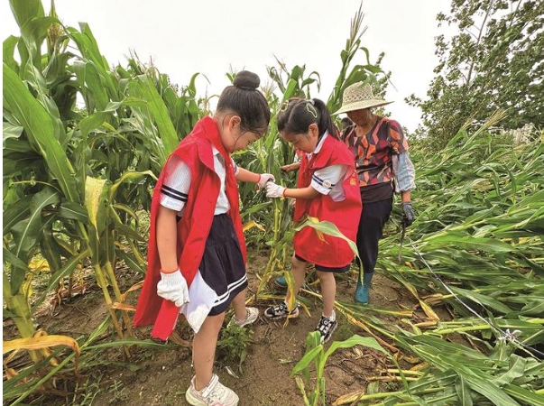 21日,海门区实验小学四(5)班满天星中队的少先队员们在辅导员老师的带领下,开展拔芦稷劳动实践活动,丰富劳动体验,感受田园生活。 通讯员梁丹丹 记者高阳