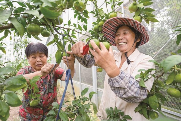 昨天,通州区金沙街道金北村的农民在果园里采摘温柑。金北村在做大做强水稻、小麦等传统粮食产业的基础上,坚持推动农业转型升级,大力发展特色农业,同时积极探索农文旅融合的新路子,助推农业增效、农民增收。 翟慧勇摄