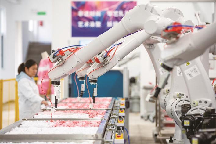 华艺集团通过机器人软件、视觉检测等,实现了产品的智能化、自动化,开启传统手工扎染向数字化转型的新时代。