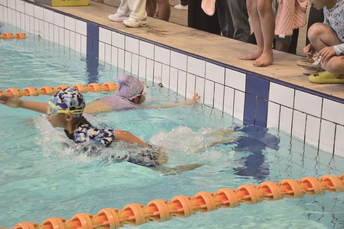 赛场如战场。水中的几条“小飞鱼”动作标准、速度飞快,谁也不肯落后。几轮交接后,六(1)班逐渐拉开差距,将对手甩在身后,以10分01秒的成绩率先触及终点的泳壁。“拿到冠军的那一刻,我内心的激动和兴奋难以言表。”该班游泳队员管姜睿笑道,“参加这次比赛不仅巩固了游泳技能,也是一次难忘的成长体验。在接近终点的那几米,我感觉非常疲惫,也曾有过松懈的念头。但对岸同学、老师的加油声让我备受鼓舞,我迅速调整呼吸和游泳节奏,咬紧牙关坚持到底。”