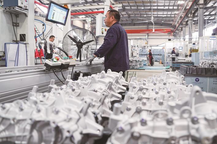 2日,在位于如东经济开发区的江苏御传新能源科技有限公司,工人在生产车间内装配新能源汽车传动系统零件。