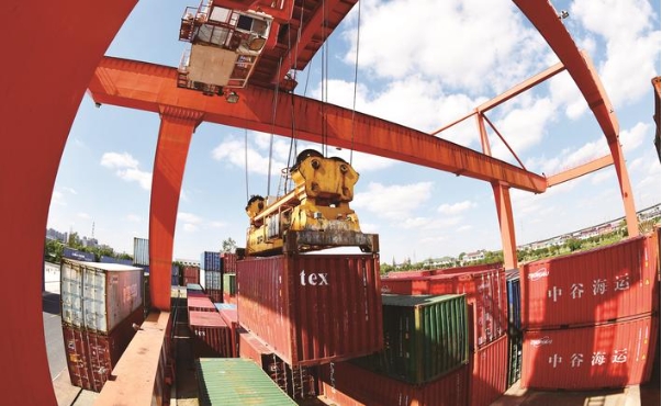 6日,海安市凤山港码头船来车往,起重机械有序装卸着集装箱和货物,一派忙碌景象。