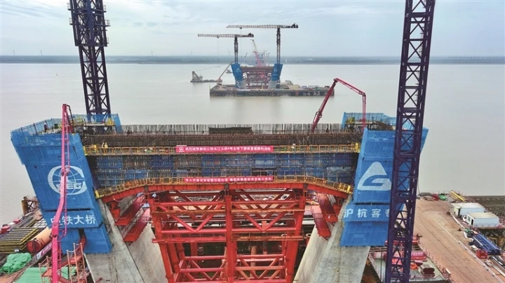 晚报讯 9日傍晚6时18分,启东长江入海口北支航道江面施工现场,经过近25个小时连续浇筑,由中铁大桥局承建的崇启公铁长江大桥4号主塔下横梁及其塔柱连接段首层浇筑完成,标志着大桥迈入新的施工阶段,为后续钢梁施工打下坚实基础。