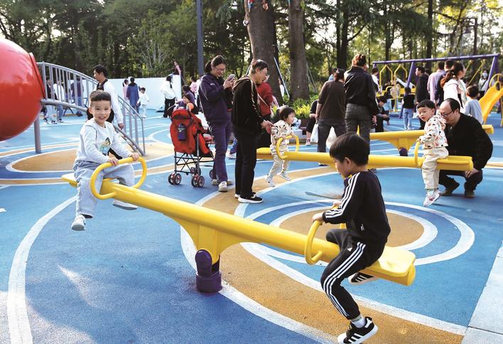 每逢周末,家住五龙云璟小区的居民袁乐按惯例在家门口的小游园遛娃赏景锻炼。孩子玩跷跷板、滑滑梯,他在一旁的健康步道跑步。小游园内,不仅风景优美、绿意盎然,彩色健康步道、单双杠、椭圆机等健身器材一应俱全。“游园合理划分了儿童游乐设施、老年人健身功能区域,为周边居民提供了一个‘家门口’的专业健身场所。”袁乐对家门口这座上榜江苏省“乐享园林”的游园赞不绝口。