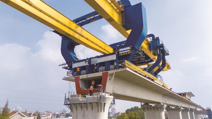 昨天,位于通州区的中铁一局沪渝蓉项目南通特大桥建设现场,工人正在进行架梁作业。沪渝蓉高铁是国家“八纵八横”高铁骨干通道之一,线路总长约2100公里,全线设计时速350公里。 CFP供图