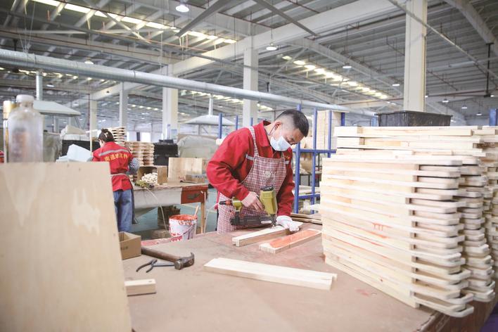 21日,如皋市吴窑镇家具产业园的南通思凯林家居有限公司内,工人正在赶制出口家具订单产品。年底将至,吴窑镇家具产业园各企业积极抢时争速赶订单,冲刺四季度,确保完成年度目标。 CFP供图