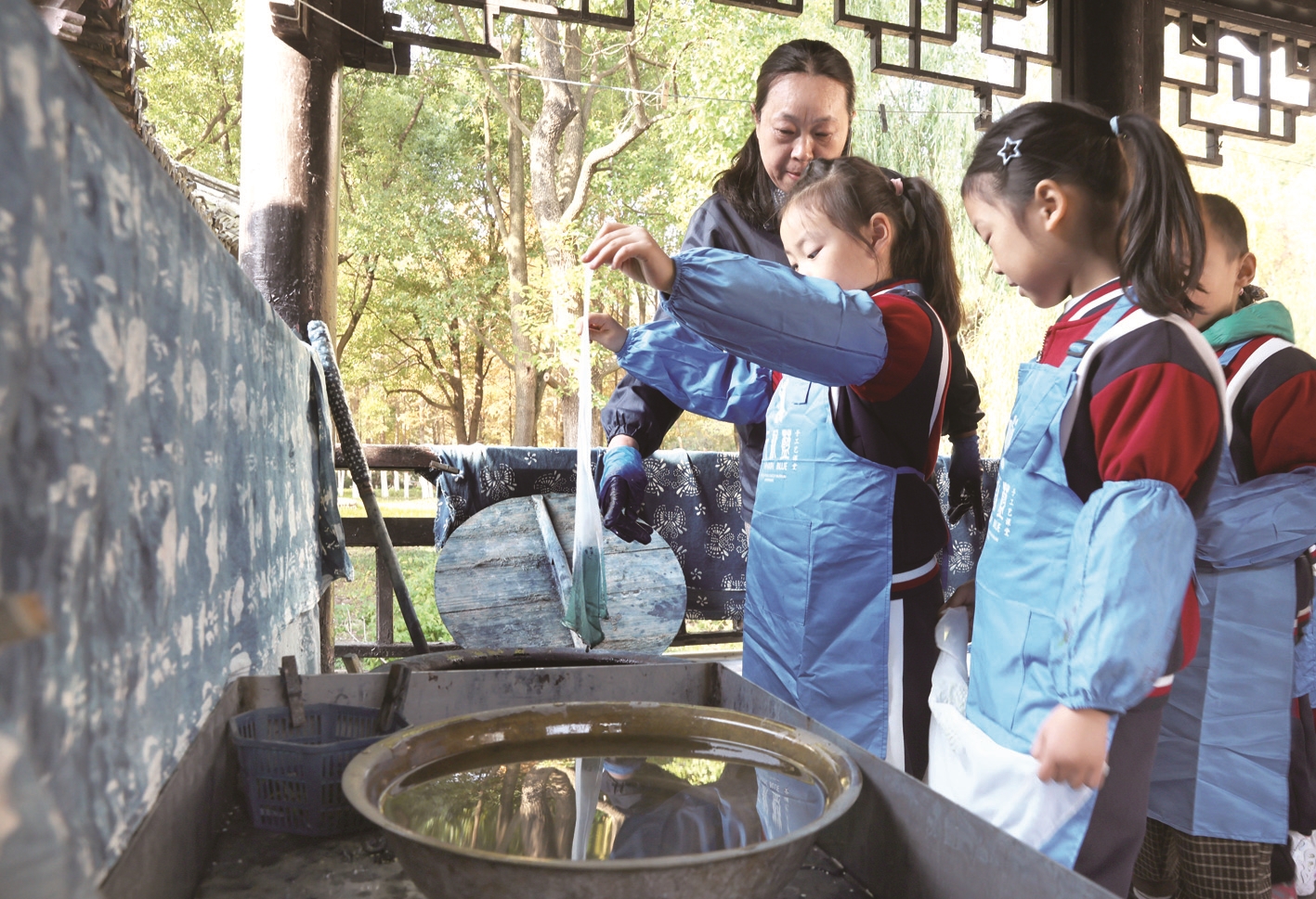2日,市城中小学的学生们走进南通蓝印花布博物馆,参与“探寻蓝白之美”非遗文化实践活动,感受中国非物质文化遗产和传统文化的魅力。 记者许丛军