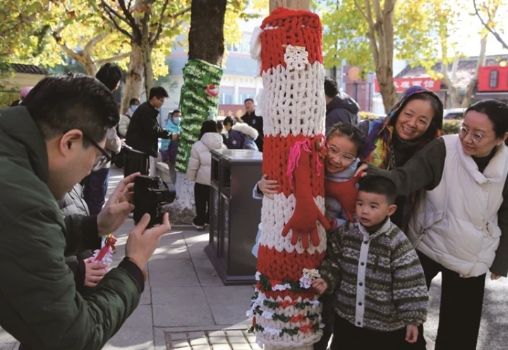 “我在小红书和微信朋友圈刷到葛多正在为法国梧桐‘穿’毛衣,就赶紧带着小孩前来打卡观赏。”市民陈女士说,去年“落叶猫”火遍通城,没想到今年葛多又有新创意,“他非常有想法,为这座城市增添了一道靓丽的风景线。”
