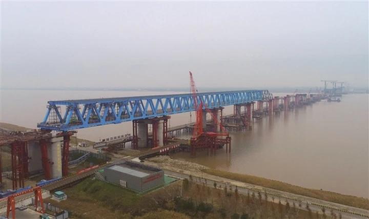 本报讯 (记者彭军君 通讯员孟庆虎 戴翀)昨天,经过72小时连续作业,由中铁大桥局承建的沪渝蓉高铁V标崇启公铁长江大桥非通航孔桥第五轮钢梁112米精准顶推到位,目前钢梁已跨过南岸江堤,越过了水中主桥S10、S9、S8、S7号墩,前五轮钢梁累计顶推长度434米,重量达11900吨,完成钢梁顶推任务三分之一。崇启公铁长江大桥主桥共有16个桥墩,分主航道和非通航孔。此次钢梁顶推为非通航孔桥钢梁,总长1205.4米,分13轮顶推,预计明年四季度与主航道钢梁吊装顶推同步完成。