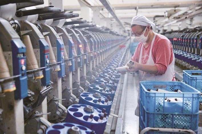 17日,在如皋市丁堰镇丁堰纺织厂,工人们正在生产线上赶制出口订单产品。进入四季度以来,企业为确保出口日本、韩国等国家的产品订单如期交付,开足马力加紧生产。 CFP供图