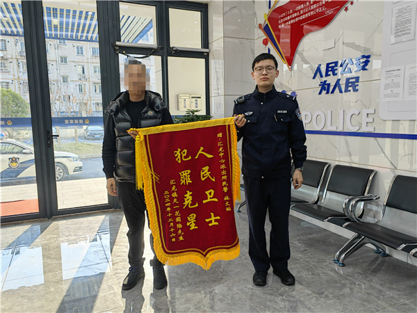 12月17日,市民陆先生将一面书有“人民卫士 犯罪克星”的锦旗送至启东市公安局汇龙镇中心派出所,对民警施文韬快速破案挽回其经济损失表示衷心感谢。