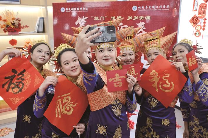 印度尼西亚留学生拿着拓印和书法作品自拍。昨天,南通科院机电与交通工程学院举办“笔墨迎春——‘敲门’送福 岁岁安澜”主题活动。该校师生与印度尼西亚留学生通过书法、拓印等活动,提前感受年味。 记者徐培钦 实习生贾冯翔 陈禹同