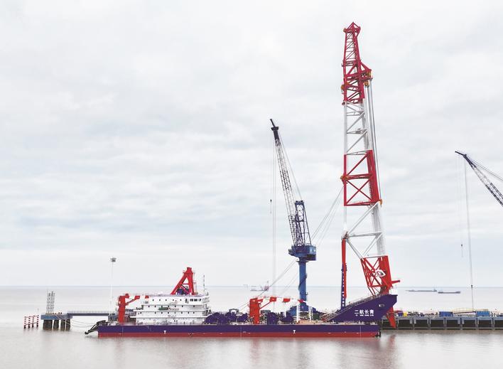 “二航长青”轮桩架高度150米,采用国内自主研发、生产制造的世界最大5000吨推力油缸,可打最大桩重700吨、直径7米的桩基。该轮首次在大型工程作业船舶领域应用柴电混合动力的工程船舶直流组网技术,可提高燃油经济性,降低碳排放。此外,船上还配备具有远海星站差分功能的打桩定位系统,可实现深远海厘米级精度打桩,是一座名副其实的“定海神器”。“二航长青”的投入使用,将为我国深远海水上工程建设以及海上风电产业链的发展注入强劲动力。