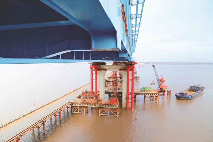 本网讯 (记者彭军君 通讯员孟庆虎 戴翀)9日,经过72小时连续作业,由中铁大桥局承建的沪渝蓉高铁V标崇启公铁长江大桥非通航孔桥第六轮钢梁112米精准顶推到位(上图 孟庆虎摄),目前钢梁已顶推到水中主桥S6号墩,累计顶推长度546米,重量达16970吨。