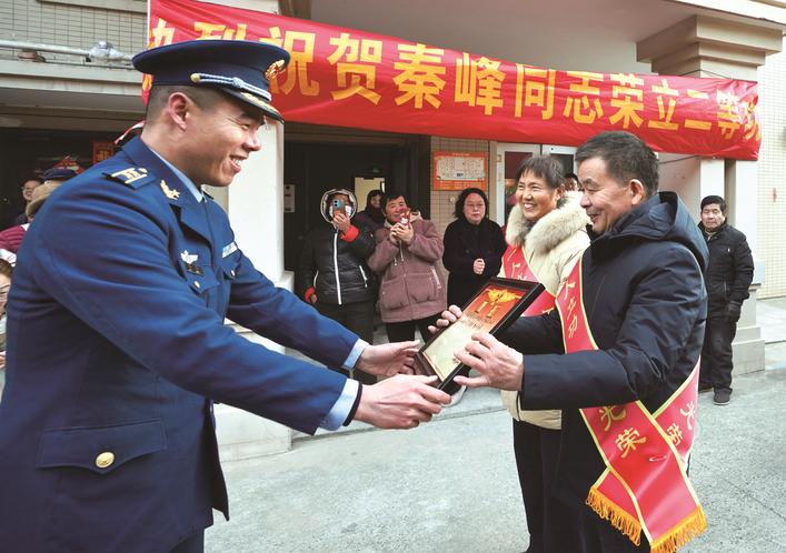 昨天下午,部队代表给军人家属颁发立功喜报。当日,崇川区委、区政府、人武部领导与空军某部代表一道,来到幸福街道秦西社区,给战备训练二等功荣立者、空军某部中校秦峰的父母送立功喜报。秦峰2006年入伍,曾两次荣立三等功,先后获得“学员标兵”“优秀基层干部”“四有优秀军官”等荣誉。2024年,崇川区双拥办共收到现役军人立功喜报21份,其中二等功1人。 赵国庆摄