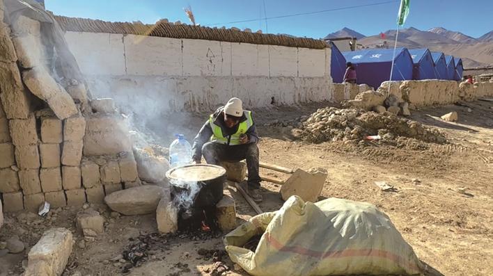 定日县海拔5000米以上,气候寒冷,救援队面临的最大问题就是吃饭。“这两天,我们吃住都在工地。没有热水和粮食,只能用几块石头搭起来,架上锅,就地生火烧热水、煮方便面。”该公司现场总负责人吴凯健表示,尽管条件十分艰苦,施工消耗的体力也很大,但他们会努力克服困难,尽量不给当地政府添麻烦。