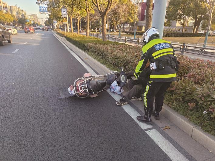 通州交警大队开发区中队铁骑队员罗纹、吴锉巡逻至上述路口北侧时,发现一名年迈的老人躺倒在马路边,身旁有一辆二轮电动车。