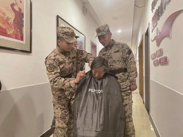 在室内的互动分享环节,“时光的故事”活动将现场气氛推向了高潮。退役军人陈启超和武警中队二级上士方松先后走上舞台,深情讲述自己的当兵故事。室外的现场志愿爱心服务同样开展得如火如荼。有理发经验的官兵和专业理发师组成了理发服务小队,他们耐心地为老人们修剪头发,每一个动作都充满了细致与关怀。经过精心修剪,老人们个个精神焕发,脸上洋溢着幸福的笑容。