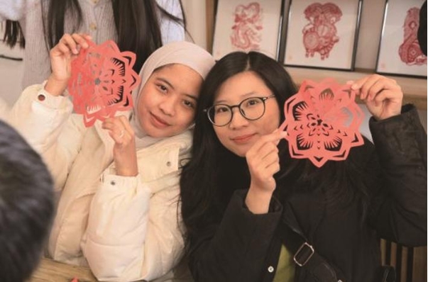 12日,一场别开生面的文化交流活动在江苏商贸职业学院开展,14名印度尼西亚留学生来到唐闸古镇体验非遗剪纸和棕编的制作,探寻中华文化脉络。